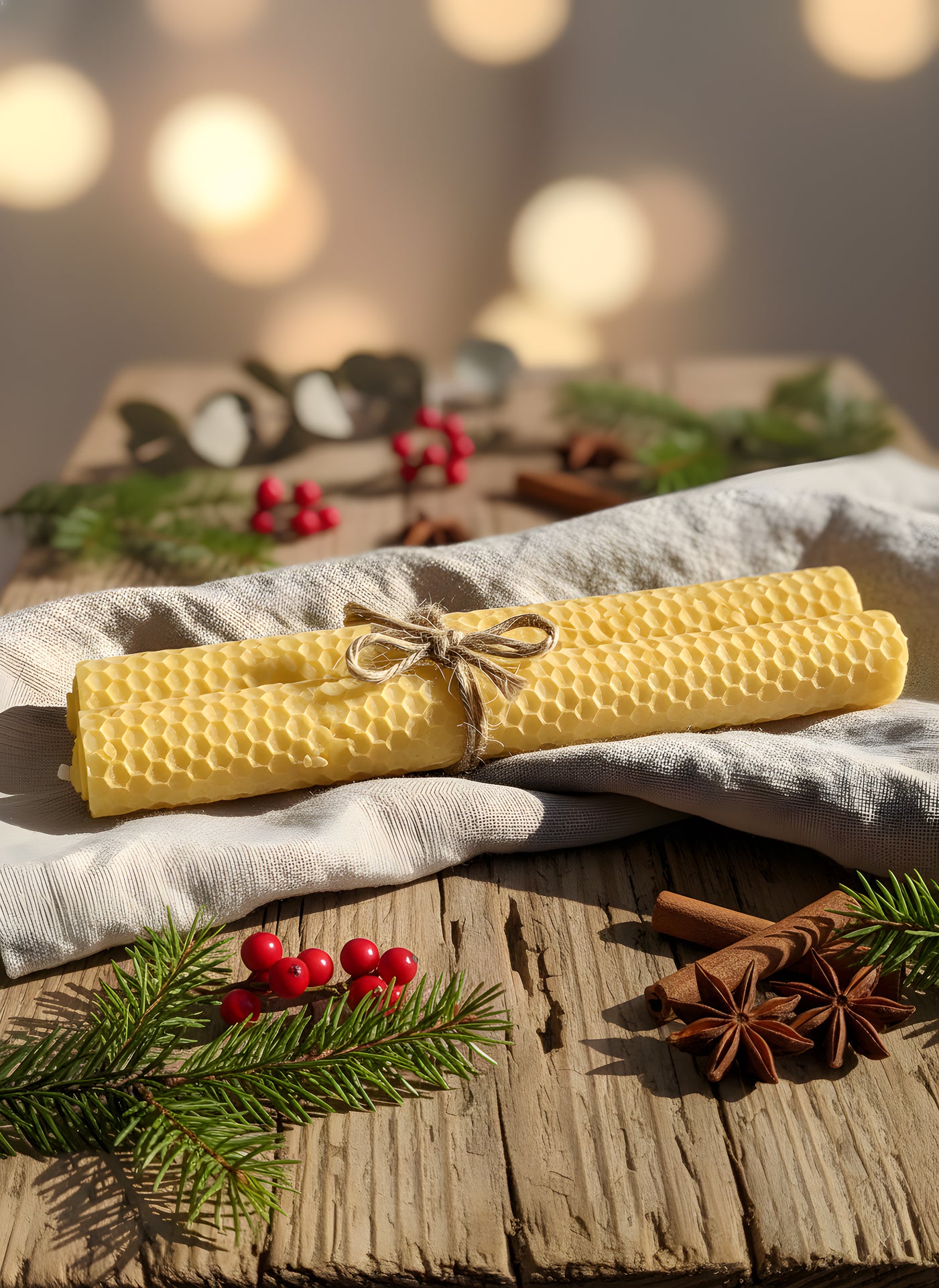 Våra cylinderformade bivaxljus är handrullade av 100% svenskt bivax och ger ett varmt, naturligt ljus med den klassiska milda honungsdoften. Perfekta för mysiga kvällar, dukningar och julstämning – eller som en vacker present.